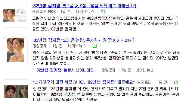 영화 '82년생 김지영' 이야기다. 오래전 소설 '82'년생 김지영'이 영화화 된다는 뉴스에도 많이 시끄러웠던 기억이 있다. 주인공에 캐스팅된 정유미를 향한 공격도...